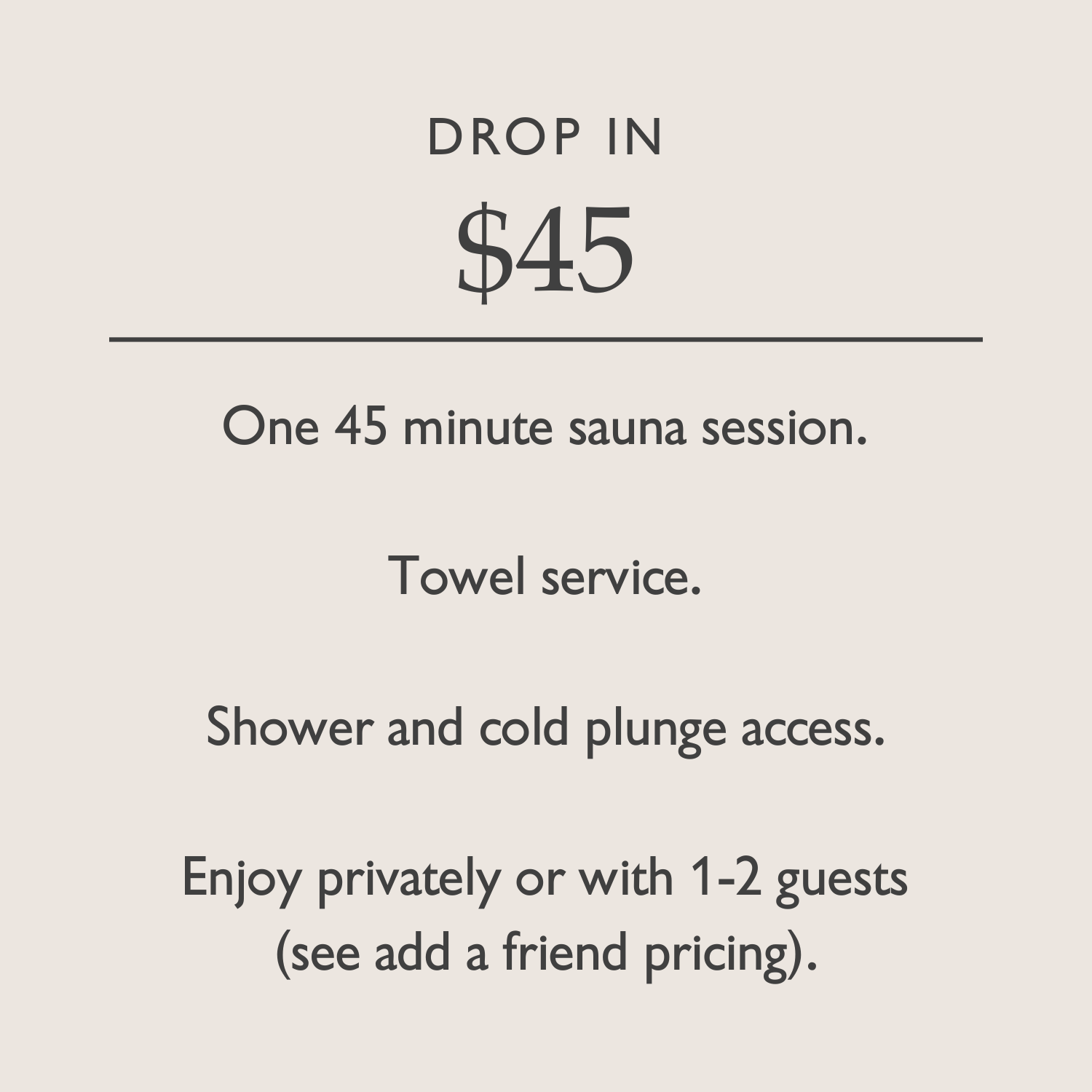 Non-Commitment Package: Whether you’re out to prove something to yourself or ready to begin a new wellness ritual, a daily sauna practice is the perfect place to start.